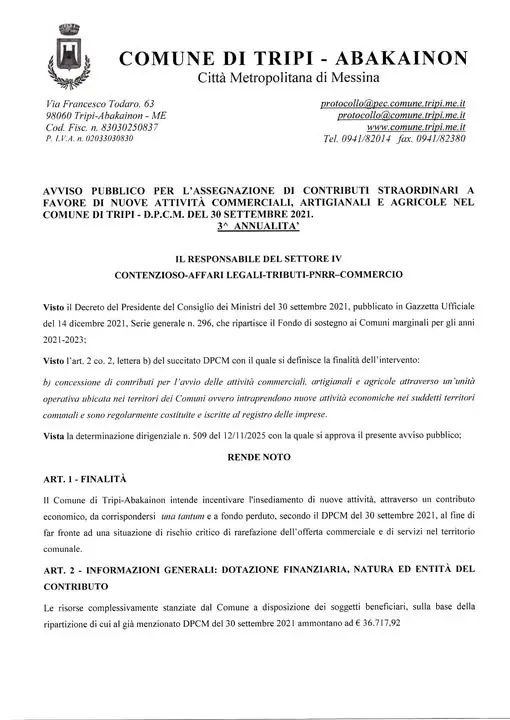 ♦️Fondo sostegno Comuni Marginali ♦️ ✌️ Pubblicato il Bando relativo alla 3 annualità “Comuni Marginali”. 🍀Previsti contributi a fondo perduto per chi apre una nuova Azienda nel territorio di Tripi-Abakainon. ℹ️ Per qualsiasi chiarimento rivolgersi all’ufficio Commercio dell’Ente. In allegato Bando
